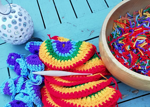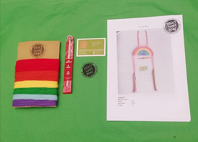 The rainbow kit includes a 5mm crochet hook, pattern and the yarn to make one six colour way Rainbow.